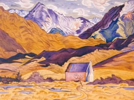 Rita Angus, Born Hastings, 1908, Died Wellington, 1970. Mountains, Cass, 1936–37, Watercolour, 36.8 x 49.6, Signed, Presented by Robert Erwin in 1985 in memory of Lawrence Baigent, Christchurch Art Gallery Te Puna o Waiwhetu, Reproduced with the kind permission of the Estate of Rita Angus.
