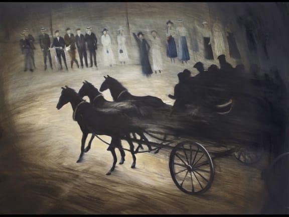 The brakes, 120 x 90. Strikebreakers were transported to and from the mine in open horse-drawn carriages, known as brakes. Sometimes a uniformed policeman held the reins. On every shift they faced a barrage of abuse from strikers and their families.