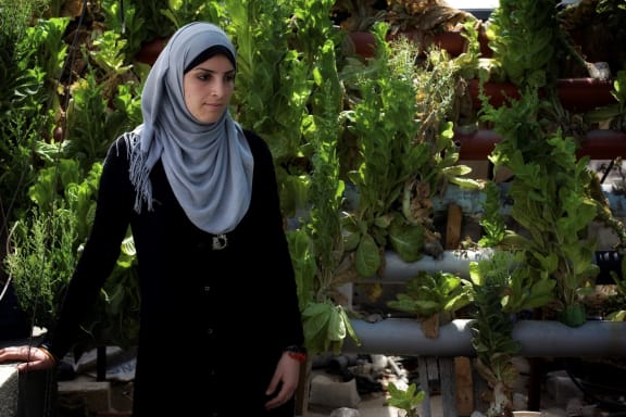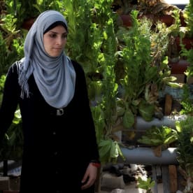 Teenager Esra Ahmad in her father’s hydroponic rooftop garden, Gaza city, April