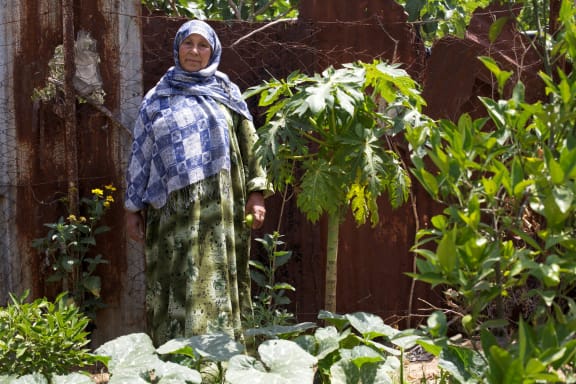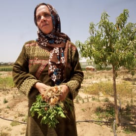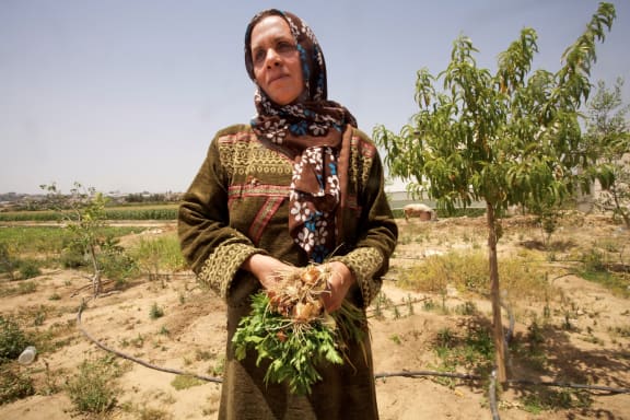 Badria with onions on the edge of her allotment garden in Beit Hanoun, Gaza,