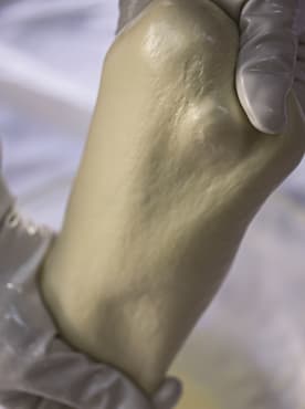 Stretching the hot curd until it is like chewing gum. Photo credit: Little Cottage Farm.