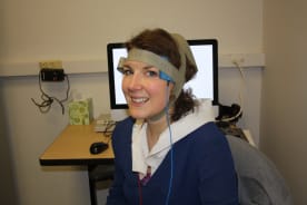 Caroline Williams with her brain wired up to a 9 volt battery before a session of transcranial direct current stimulation. The aim was to turn down activity in the thinking parts of the brain (under the electrode) to allow weaker, creative signals to burst through.