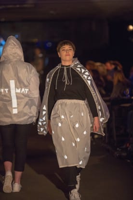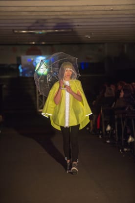 (L-R) Model Lizzie Drake wears designer Shannon Crome’s white hooded jacket; model Sophie Wright wears designer Denise Anglesey & Zorro Potion’s hooded cape, and designer Sarah Lancaster’s rain skirt.