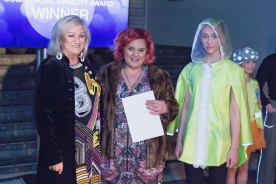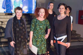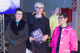 Lux Luminance Award Winner (L-R) Mary Laine from the Wellington Lux Festival, designer Fiona Pohlen of Wellington, Model Hariata Hema wearing Fiona’s award winning hot pink jacket with in-built rear flashing lights.