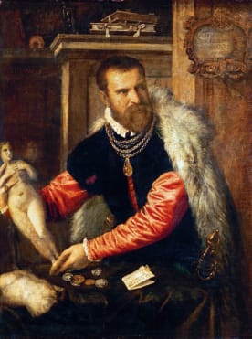 Titian, Portrait of Jacopo Strada, 1567. His hands hold the work of art but his eyes engage the unseen collector in a timeless image of salesmanship