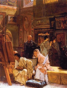 Sir Lawrence Alma-Tadema, A Visit to the Art Dealer, featuring Ernest Gambart (standing, centre) as a gallerist of Antiquity.